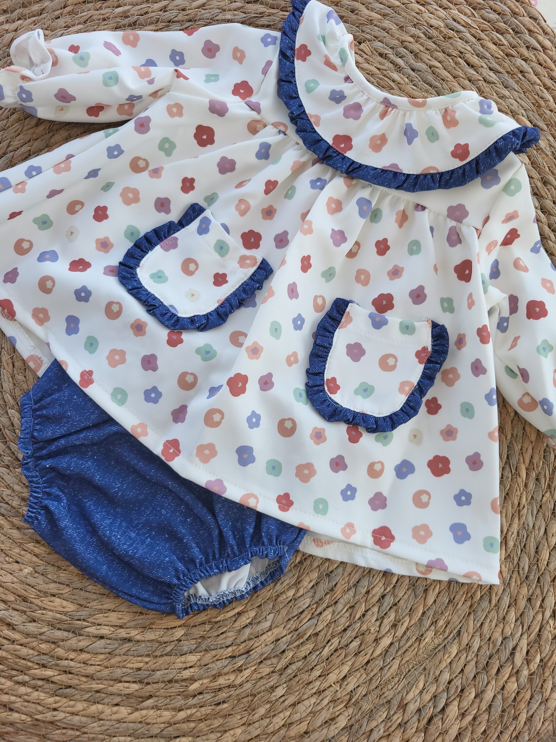 Precioso vestido de flores, con bolsillos a los lados, acompañado de braguita a juego.