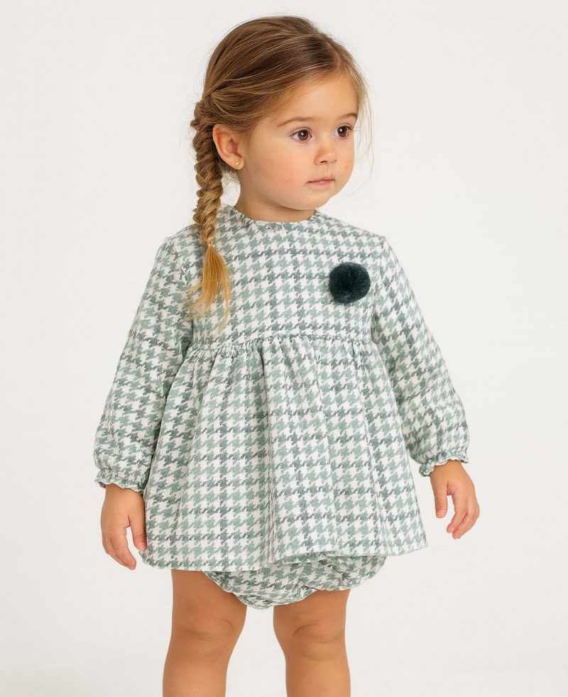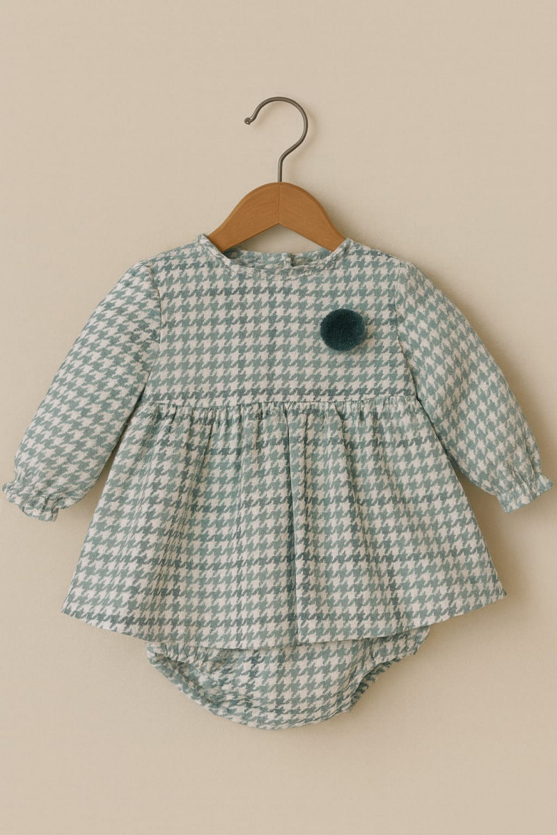 Conjunto pata de gallo verde con braguita. formado por un vestido jesusito de algodón estampado con patas de gallo. Cuello redondo, botones en la espalda, pompón en el pecho. braguita del mismo tejido y estampado con elásticos anti presión. Diseño clásico e imprescindible en cucufletes, siempre actual y en tendencia. Los conjuntos elegantes y suave con estampado clásico de pata de gallo, pensado para los días frescos de otoño o las reuniones especiales. Atemporal, cómo y con un toque de distinción 🍃.
