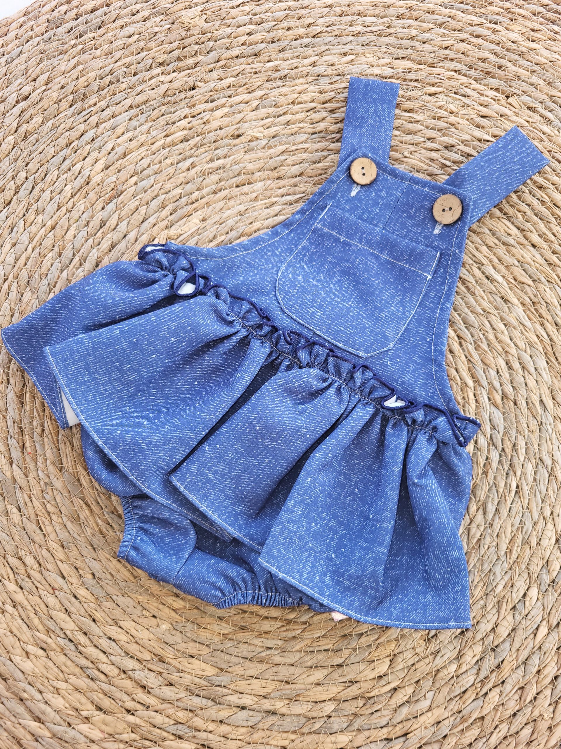 Peto de tirantas, abrochado en botones, braguita con elásticos antipresión, falda.