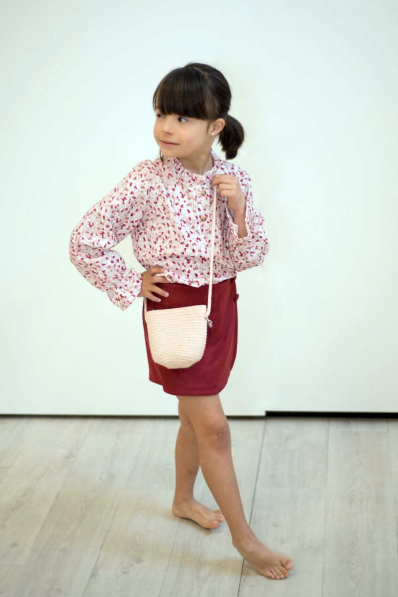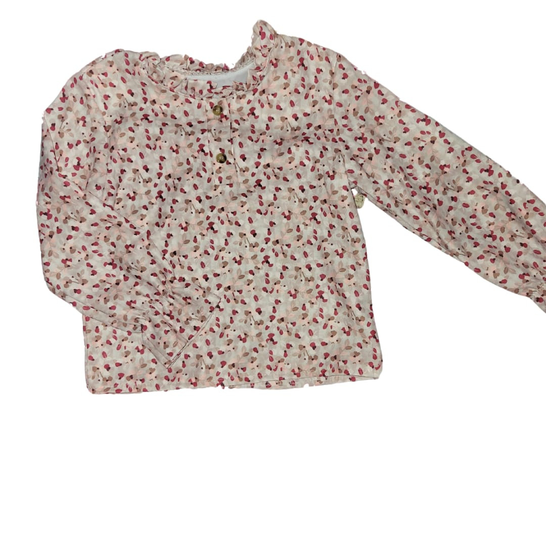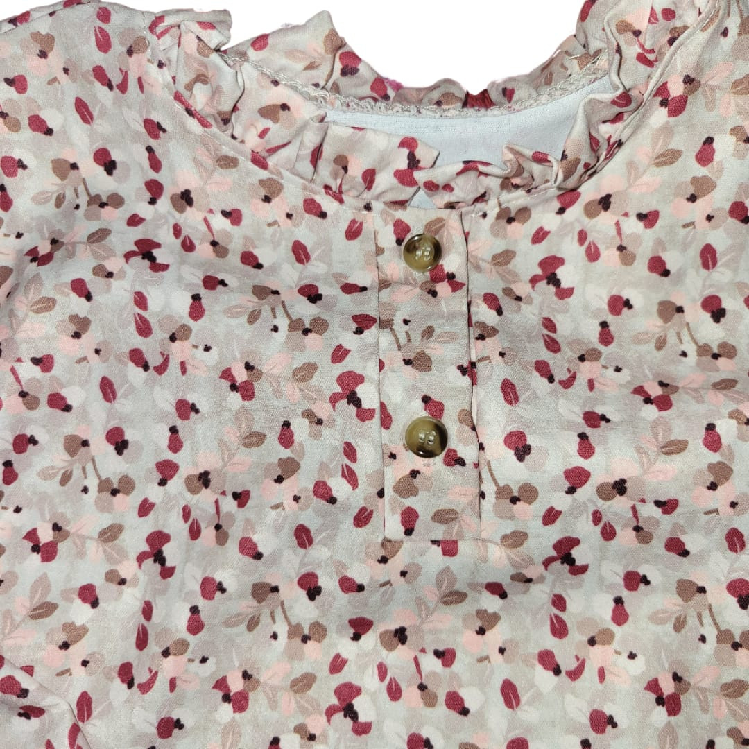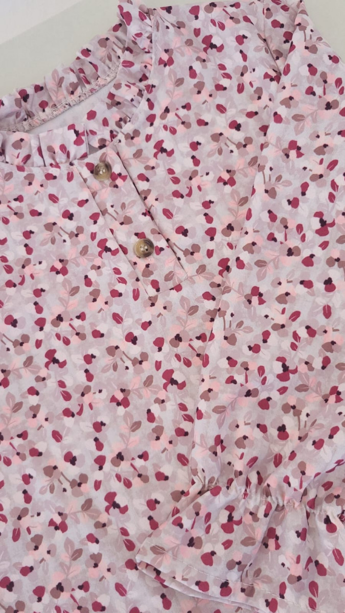 blusa de ramitos en diferentes colores coordinados entre sí. volantes en los puños y en el cuello, botones delanteros.