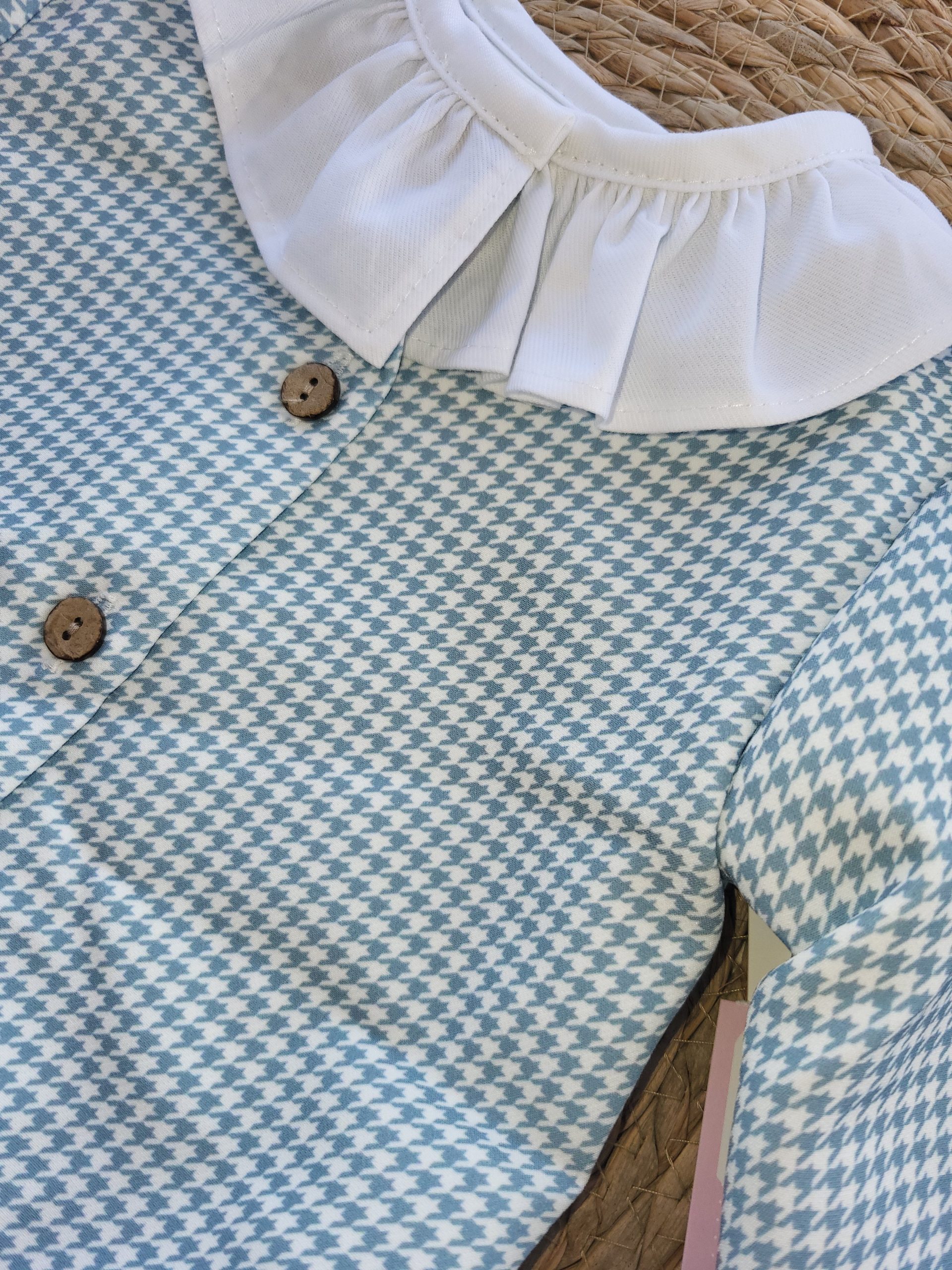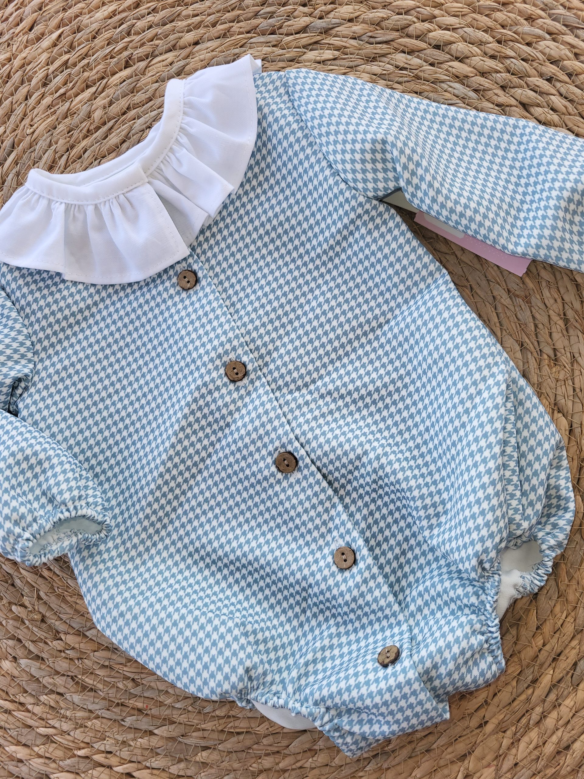 pelele de pata de gallo, con cuello volante, color agua combinado con color blanco, manga larga, abotonado.