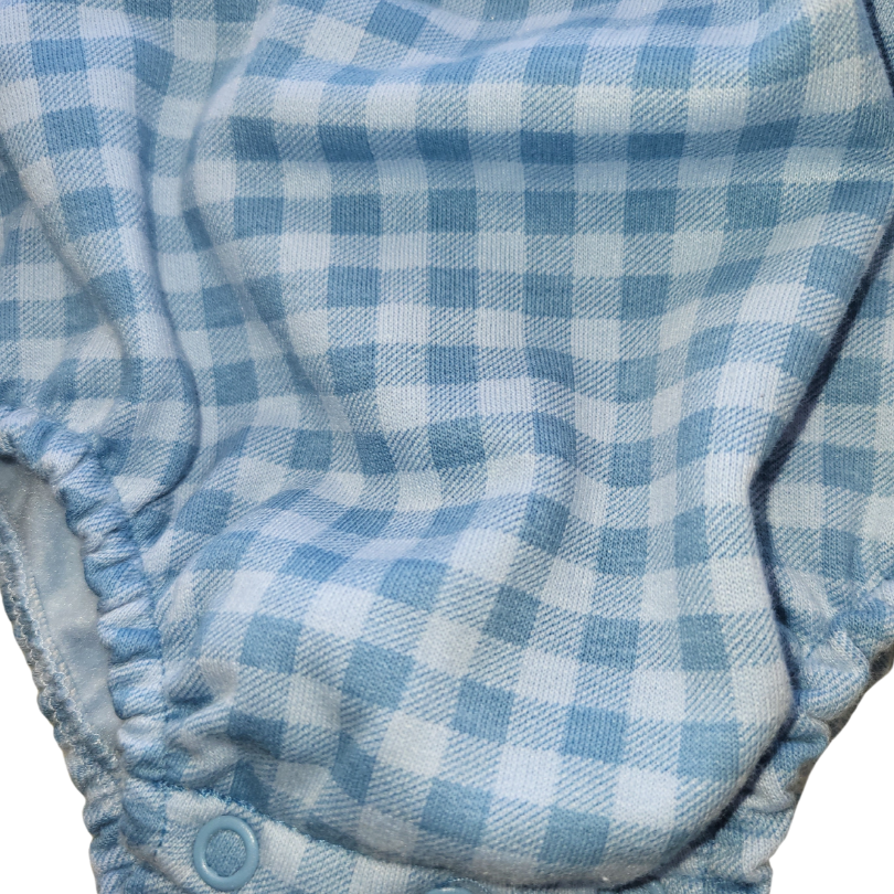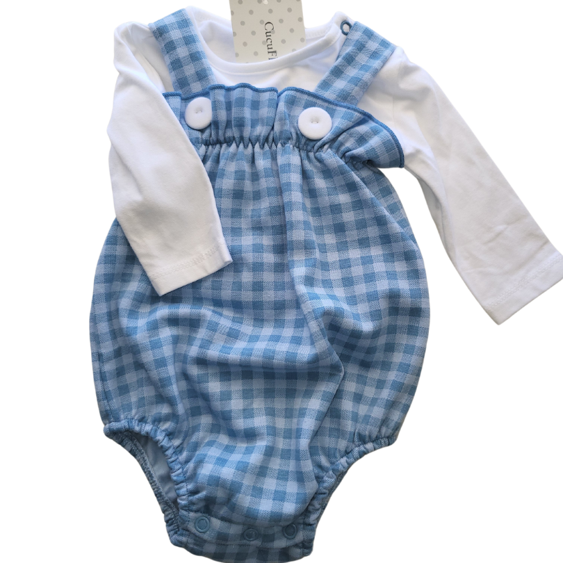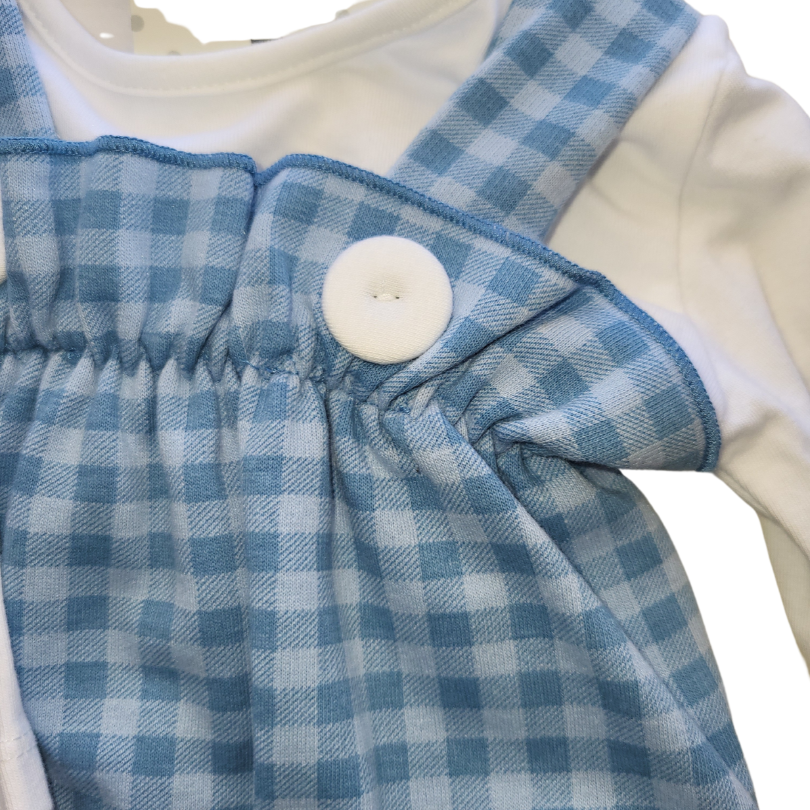 Conjunto compuesto de camiseta de manga larga de algodón y peto bombacho de tirantes ancho, abrochado a la entrepierna.