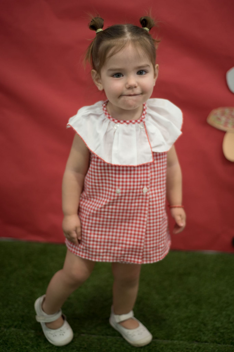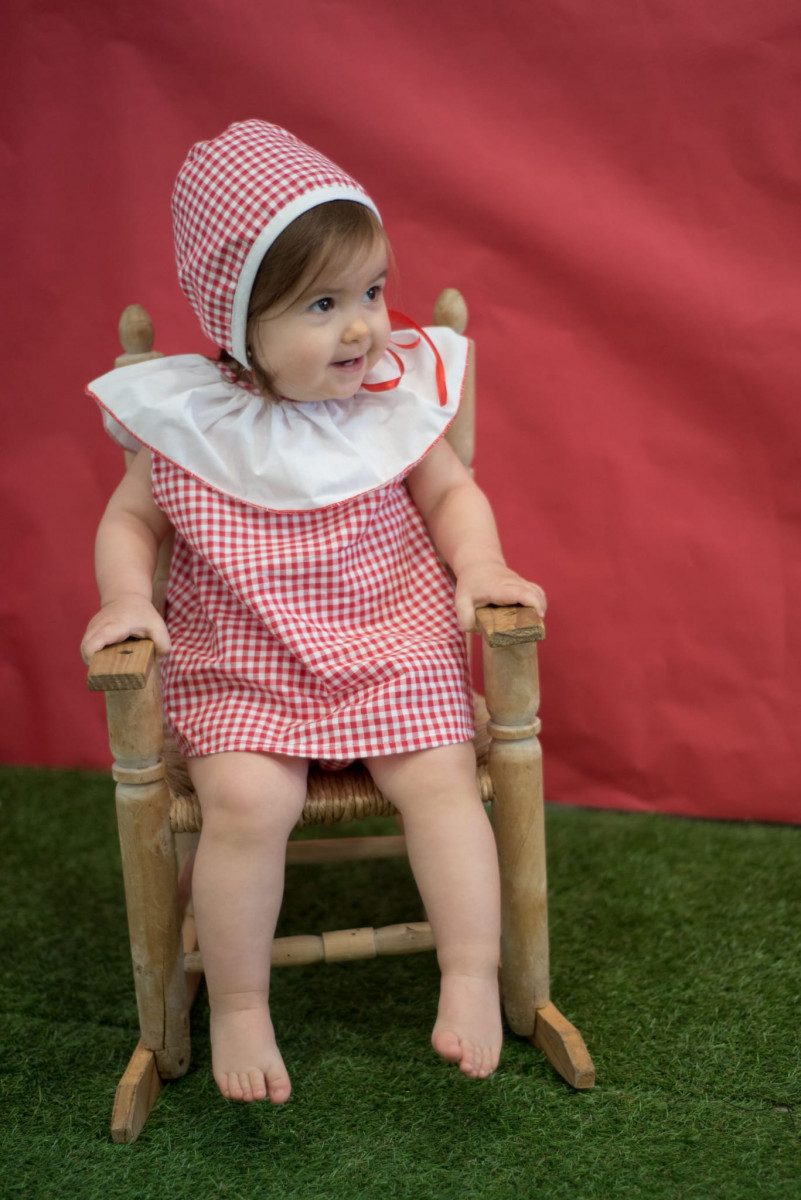 jesusito de vichy rojo formado por vestido, capota y braguita a juego.