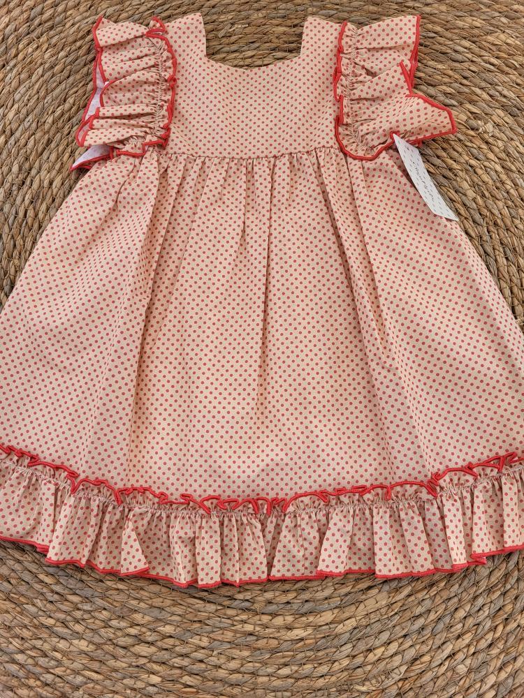 Vestido camel de lunares color coral fuerte. Manga de tirantas con volante, forro interior abrochado a la espalda con cremallera invisible.
